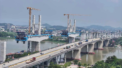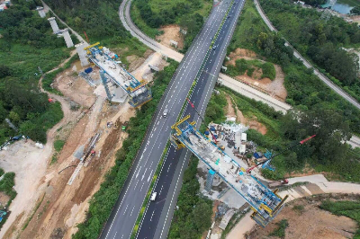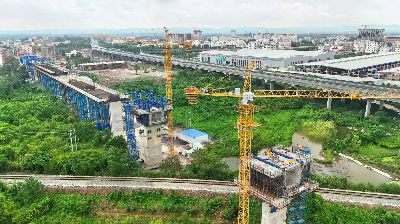 在深南高铁现场,建设者在172处关键工点不停施工,项目建设正在加快推进。目前,深南高铁罗定江特大桥64米钢构连续梁0号块已经浇筑完毕,正在进行桥面养护。罗定制梁场的架桥机已经组装完毕,为10月中旬的箱梁顺利架设奠定基础。